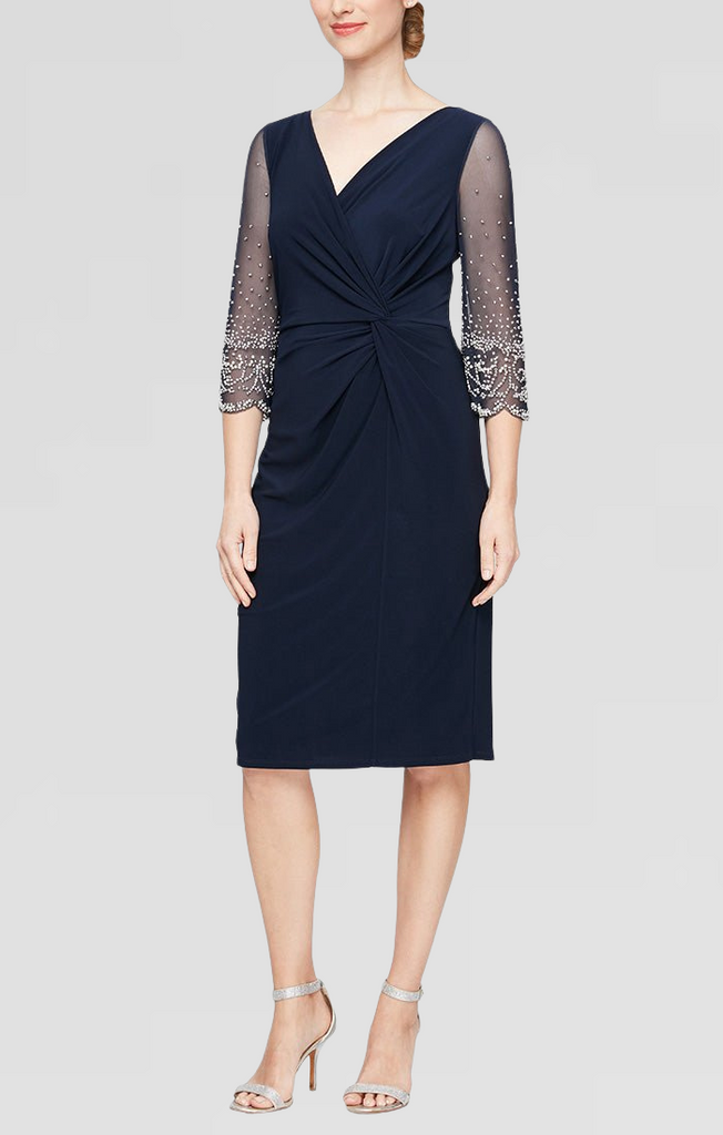 Short Contour Sheath Dress with Surplice Neckline, Gathered Waist Detail and Overlay Skirt