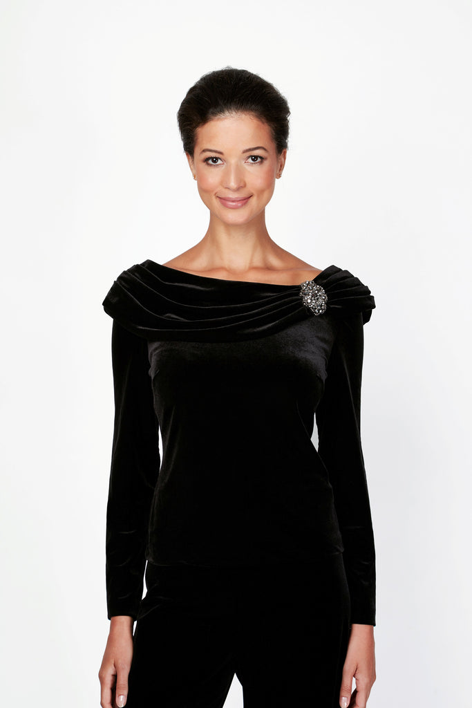 Long Sleeve Velvet Blouse with Ruched Collar Neckline & Decorative Broach