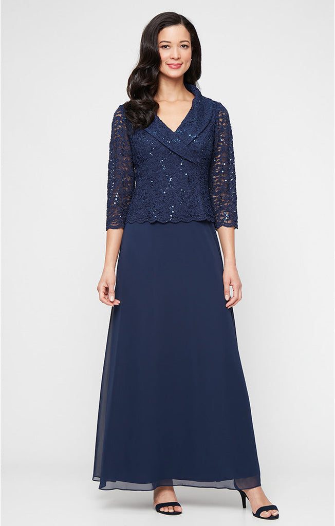 Long Stretch Lace Mock Dress with Portrait Collar Neckline and Chiffon Skirt