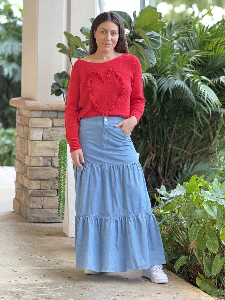 Long Matte Jersey Dress with Sweetheart Heat Set Embroidered Neckline and Cascade Detail Skirt