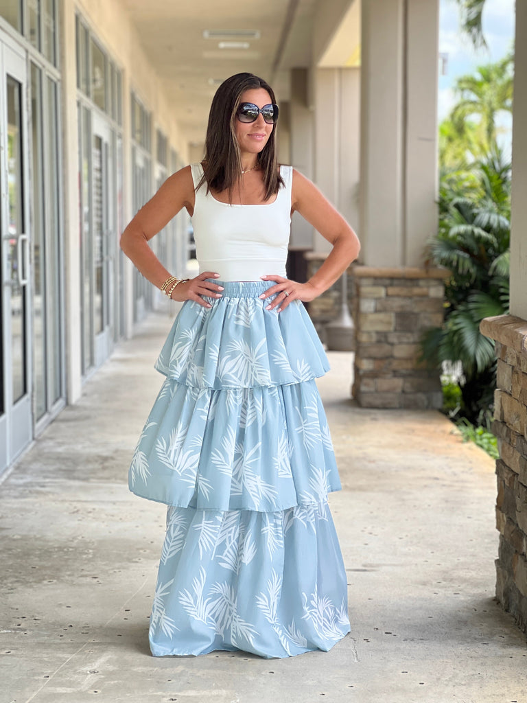 Long Empire Waist Dress with Soutache Bodice, Puff Sleeve Detail and Cascade Ruffle Skirt
