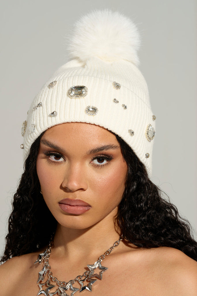 DIAMOND HOUR EMBELLISHED BEANIE IN WHITE