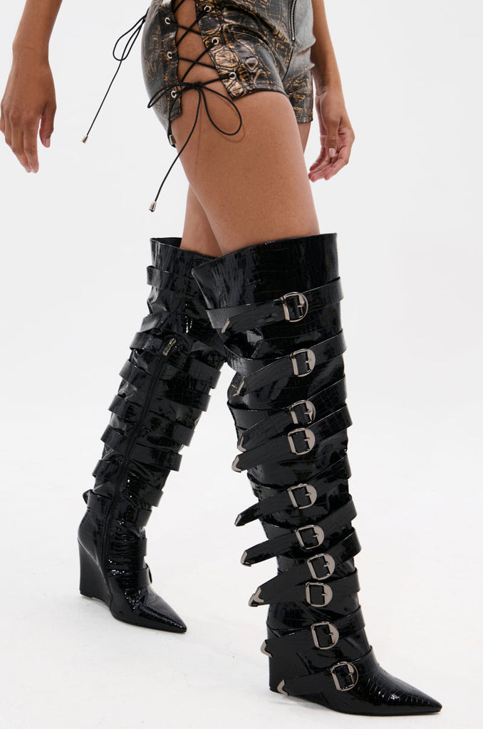 AZALEA WANG CINZIA BLACK CROC BUCKLE WEDGE BOOT